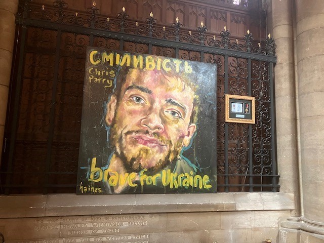Currently displayed in the South Aisle of the cathedral is a portrait of Chris Parry, the young Cornish volunteer who was killed in early 2023 in the Ukraine, while working as a rescuer. The portrait was painted by Russell Haines and is accompanied by a medal given to Chris by the Ukraine government, acknowledging his courage in rescuing more than 400 civilians from the front lines following the Russian invasion.
