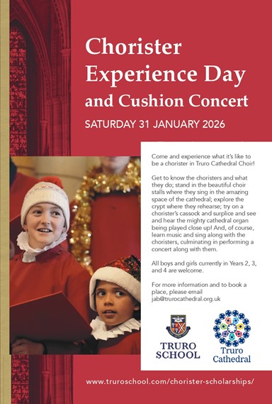 The choristers of Truro Cathedral are delighted to invite girls and boys in Years 2, 3 and 4 to their annual Chorister Experience Day on Saturday 31 January, 2026.
