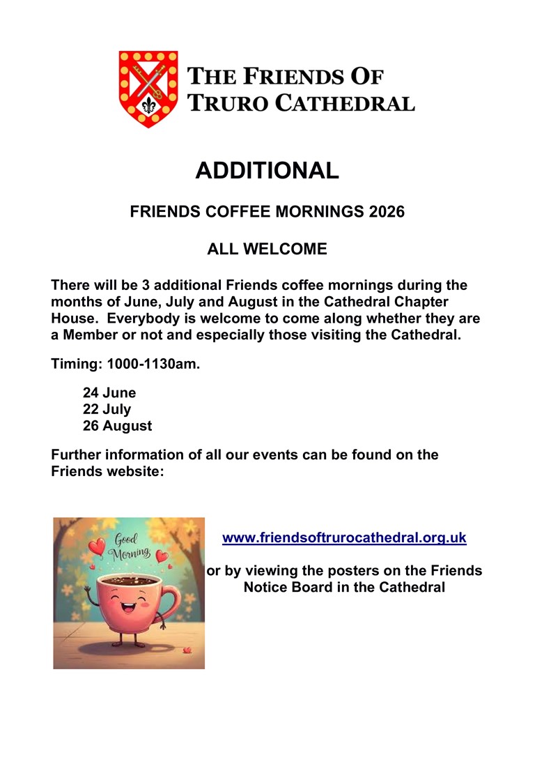 There will be 3 additional Friends coffee mornings during the months of June, July and August in the Cathedral Chapter House. Everybody is welcome to come along whether they are a member or not and especially those visiting the cathedral.